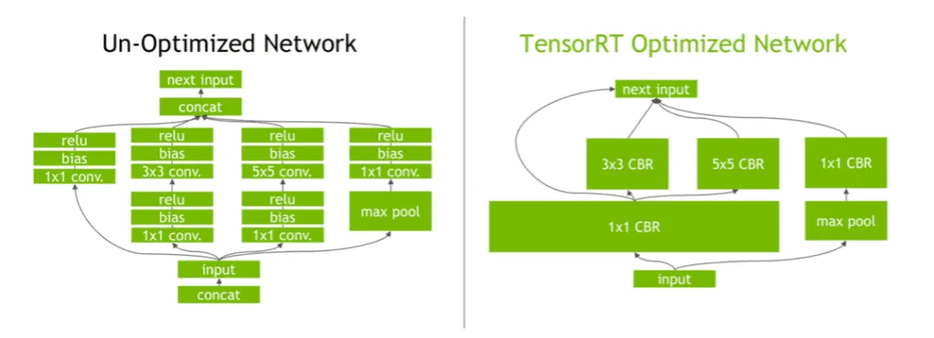 Figure 2. A GoogLeNet Inception module network before and after layer fusion performed by NVIDIA’s TensorRT™ Optimizer. Original image available in this blog post by NVIDIA.