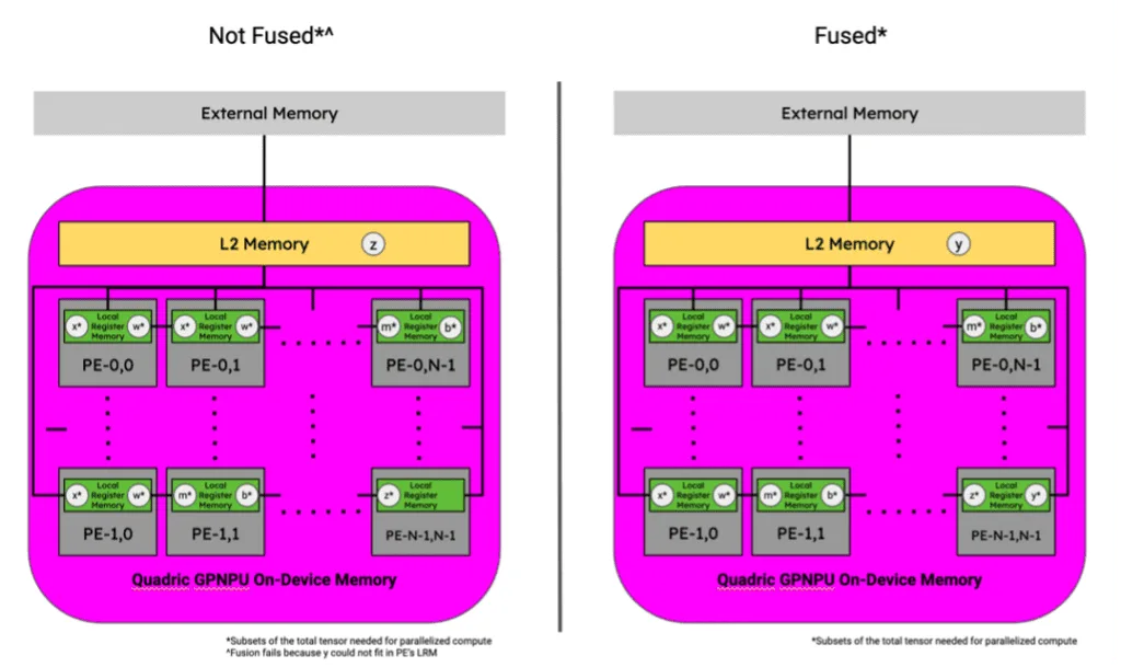 The most performant NPU’s are designed with operator fusion in mind for a limited set of permutations of operators. Since they are hard-wired and therefore cannot be programmed, they cannot handle memory reshaping or reorganization or even fuse some activation functions that aren’t handled by their coupled hardware blocks. To perform these operations, the programs must write back out to some shared memory: either on device or shared memory on the SoC.